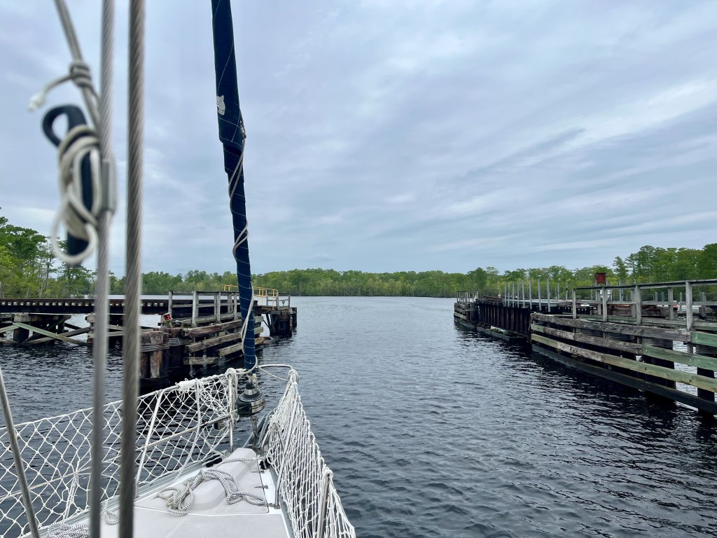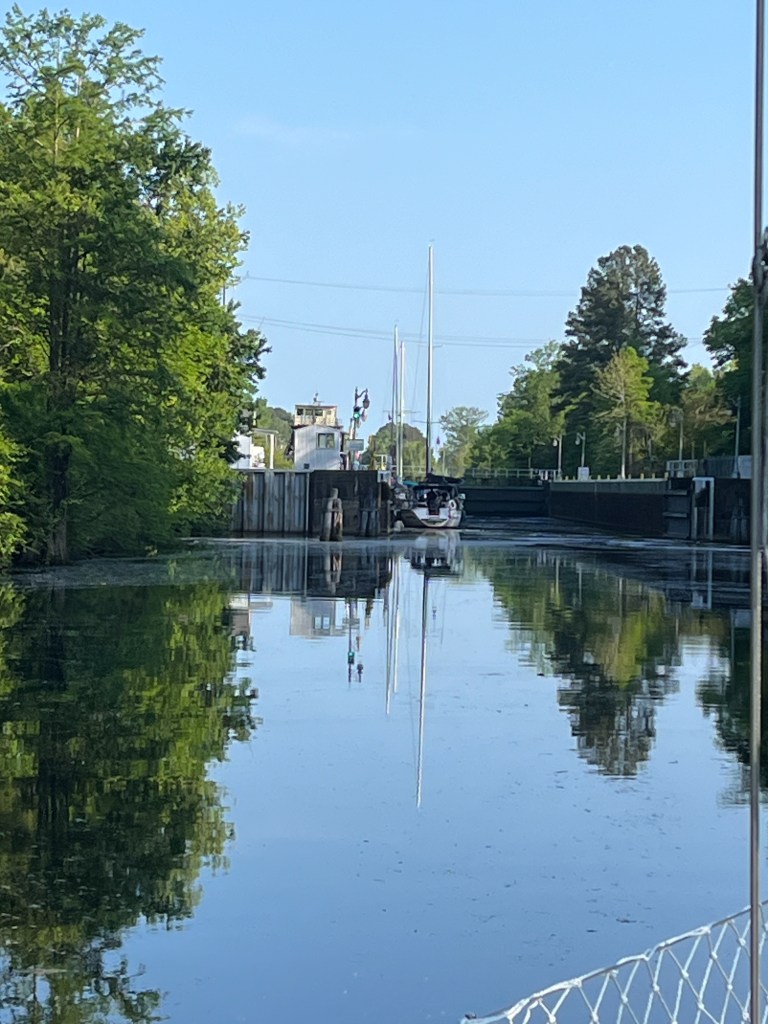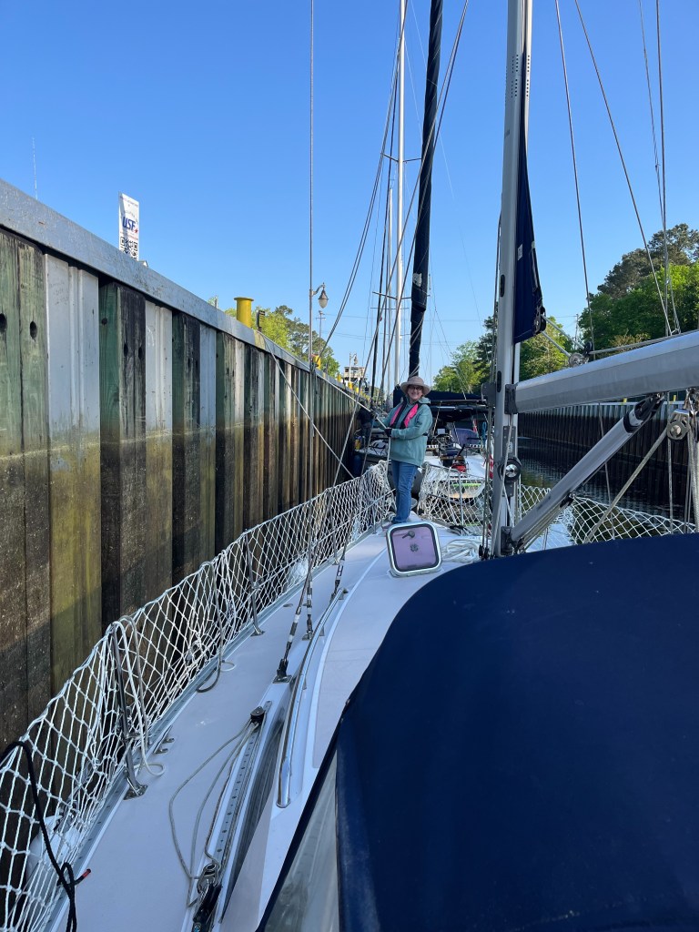 Locking was a brand new experience for us. We both had such nerves going in, but the lock tenders at both South Mills and Deep Creek were extremely kind and helpful. Both open on a schedule, so you have to be sure to time your arrivals. We were all a few minutes early to the 8:30 am opening, so we put the anchor down and held steady until we received the all-clear to proceed. One by one, each boat entered the lock. We were instructed ahead of time via radio that it would be a port side tie-up and that we needed to have a 25 foot minimum line on both bow and stern. As we sidled up to the wall, the lock tender grabbed the bow line I was holding and secured us to a piling above the wall. Then he secured the stern line in Charro’s hand.