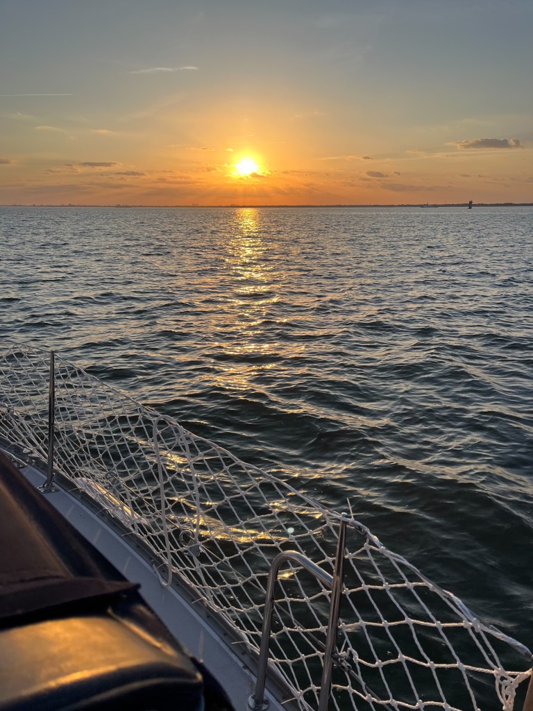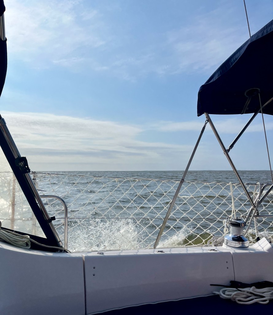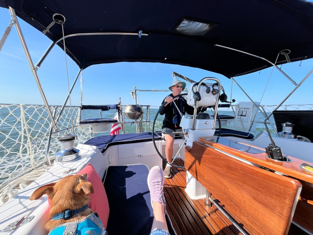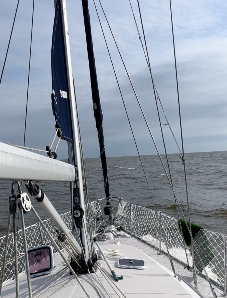 As I write this, it is 12:00 on Monday. I am actually typing this post from the cockpit as we motor north on the Chesapeake Bay! I don’t know who wrote today’s forecast, but this morning winds were definitely not out of the SW and DEFINITELY not 10-15 knots. Instead we saw 15 -20 knots out of the west (gusts in the 20’s) with 2-3 ft waves. Things have finally calmed down. Winds are currently 10 knots out of the west.