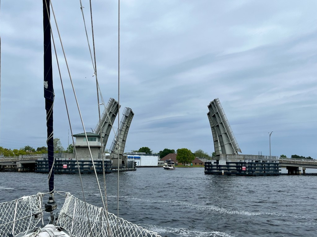 Roughly two hours later, we arrived in Elizabeth City, where almost immediately, we came to the Elizabeth City Bridge (a drawbridge). We hailed the bridge tender for an opening. There was one boat in front of us and the tender was waiting on a third to arrive behind us. So for maybe ten minutes or so, we circled and held until we received the all-clear to motor through. I couldn’t help but sing the chorus, “When you get caught between the moon and New York City” while we waited.