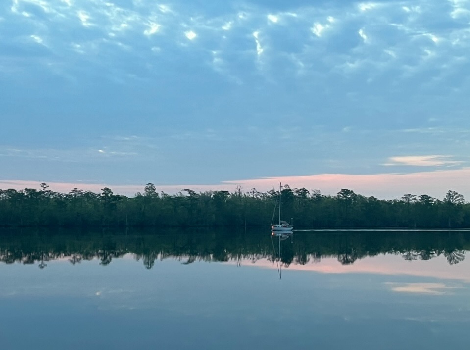 We are currently stopped for the night in a truly beautiful, scenic, peaceful spot on the Pasquotank River, just outside of the ICW next to Goat Island. This is my absolute favorite spot so far! Since we arrived, we have seen three fisherman in johnboats and only two other ICW travelers. We are hopeful that the lack of transiters means we won’t have much competition to tie up at the free dock tomorrow.