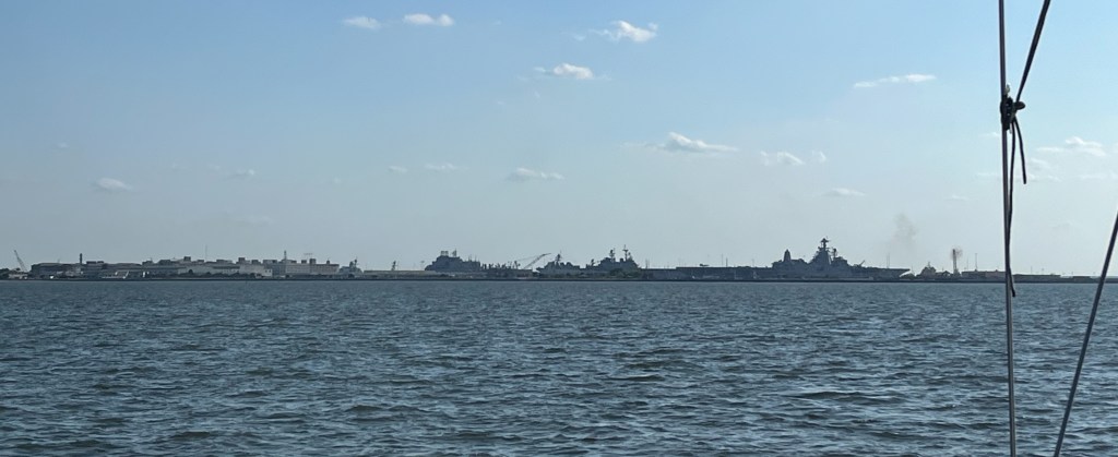 The 10 nautical mile stretch through Hampton Roads was a sight to see! I am thankful we traveled through on a Sunday when commercial and military traffic is minimal. I imagine it can get quite hairy on a weekday. The most impressive section was passing warship after warship after warship. You don’t realize how LARGE they are until you see them up close. Unfortunately, I do not have photos of them. Marine military police patrol and guard the area and it is said that they don’t care for it when people take photos. It’s a security thing. We didn’t want to do anything that might provoke them to stop us.