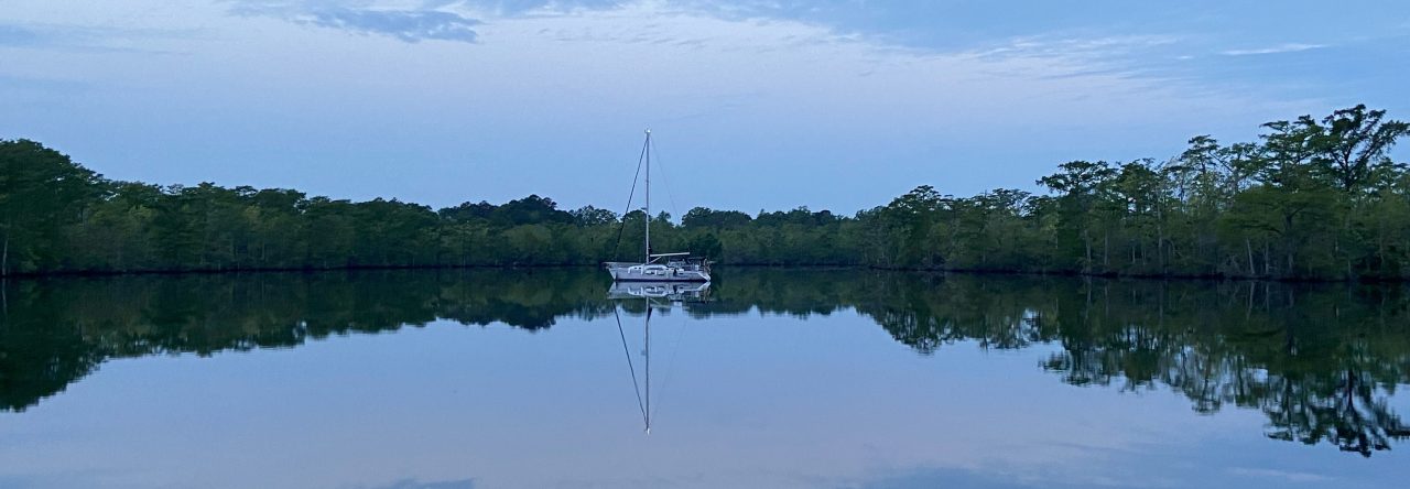 We are currently stopped for the night in a truly beautiful, scenic, peaceful spot on the Pasquotank River, just outside of the ICW next to Goat Island. This is my absolute favorite spot so far! Since we arrived, we have seen three fisherman in johnboats and only two other ICW travelers. We are hopeful that the lack of transiters means we won’t have much competition to tie up at the free dock tomorrow.